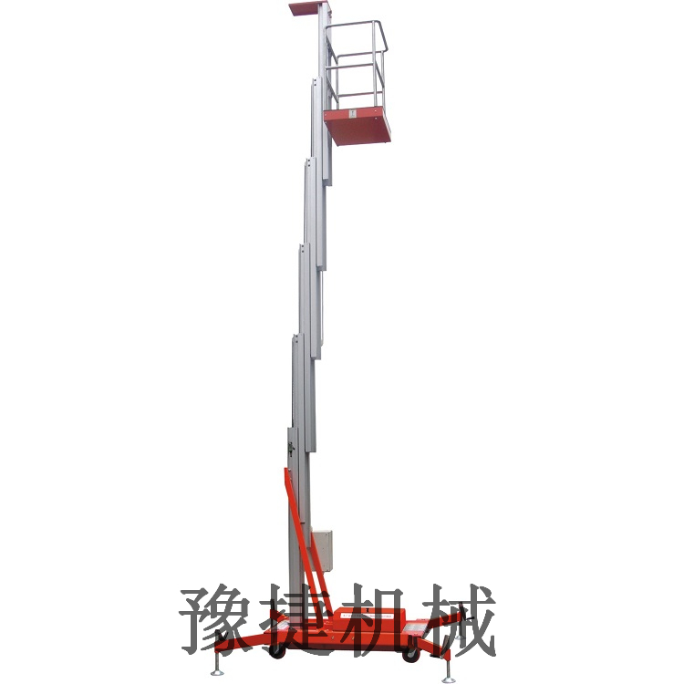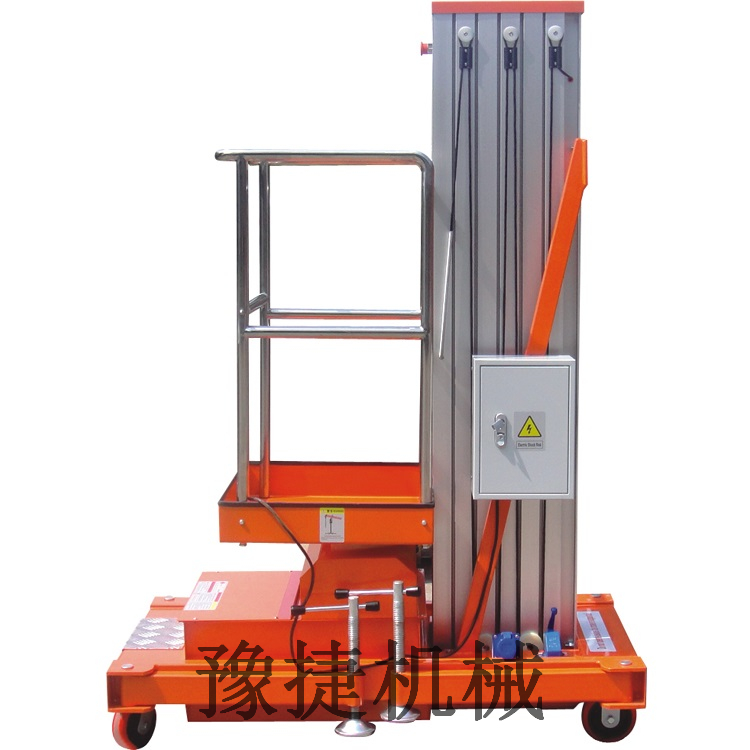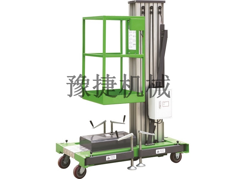 单桅铝合金升降平台:采用优质铝合金材料,具有造型美观、体积小、重量轻、升降平稳、安全可靠等优点。广泛用于工厂、宾馆、餐厅、车站、影剧院、展览馆等场所,是保养机具、油漆装修、调换灯具、电器、清洁保养等用途的理想安全伴侣。
